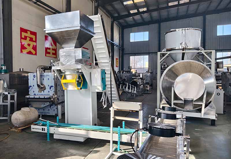 Process flow: Raw material preparation → powder mixing → extrusion molding → vibration screening → wind conveying → drying→ conveying → oil spraying → seasoning → cooling
