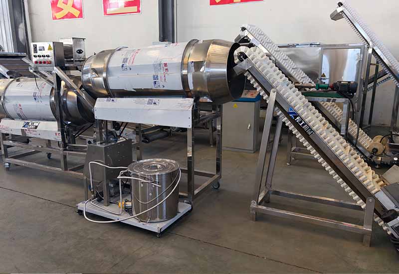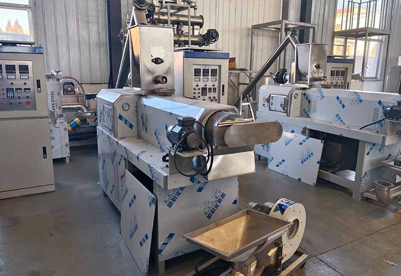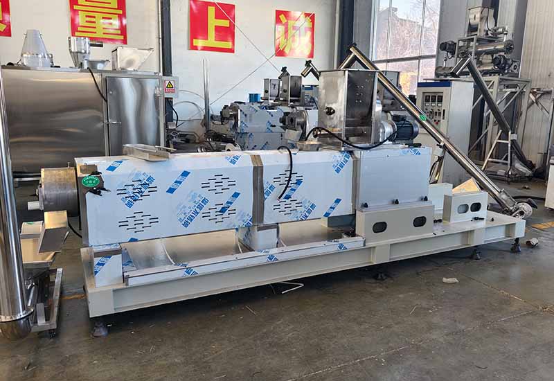 Equipment configuration: Mixer → Feeder → Twin-screw extruder → Vibrating screen → Air conveyor → 5-layer 10-meter → electric oven → Elevator → Oil sprayer → Seasoning double roller → Cooling conveyor